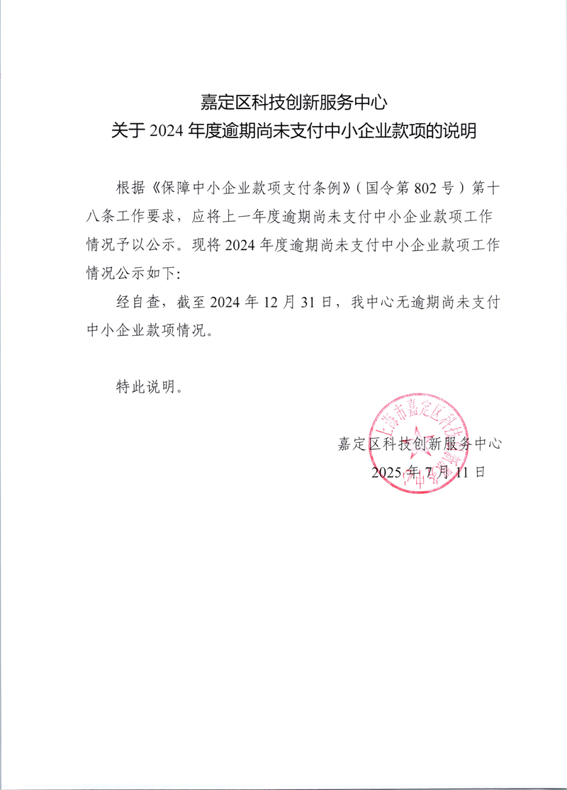 索引号: 00001434-9/2025-00000066 发布机构: 区科委 发文日期: 2025年07月11日 主题分类: 政府债务情况 关键词: 嘉定区科技创新服务中心关于2024年度逾期尚未支付中小企业款项的说明 发布时间:2025-07-11 浏览次数: 次 【字体:小 大】