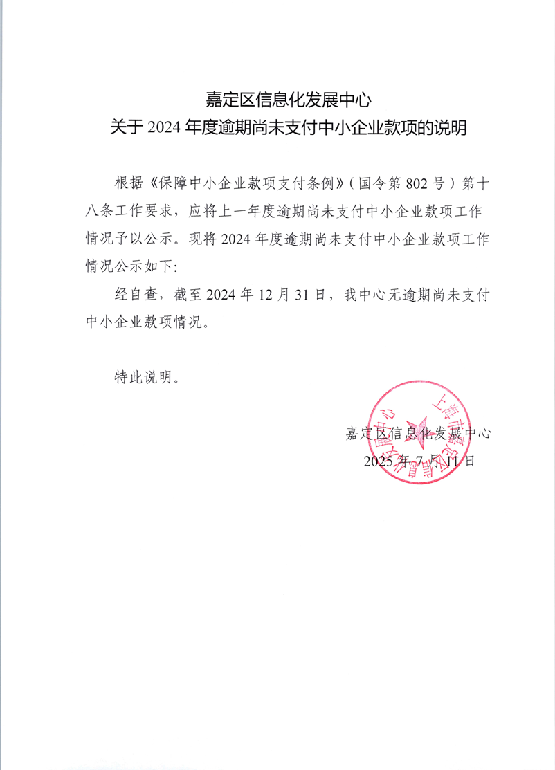 索引号: 00001434-9/2025-00000067 发布机构: 区科委 发文日期: 2025年07月11日 主题分类: 政府债务情况 关键词: 嘉定区信息化发展中心关于2024年度逾期尚未支付中小企业款项的说明 发布时间:2025-07-11 浏览次数: 次 【字体:小 大】